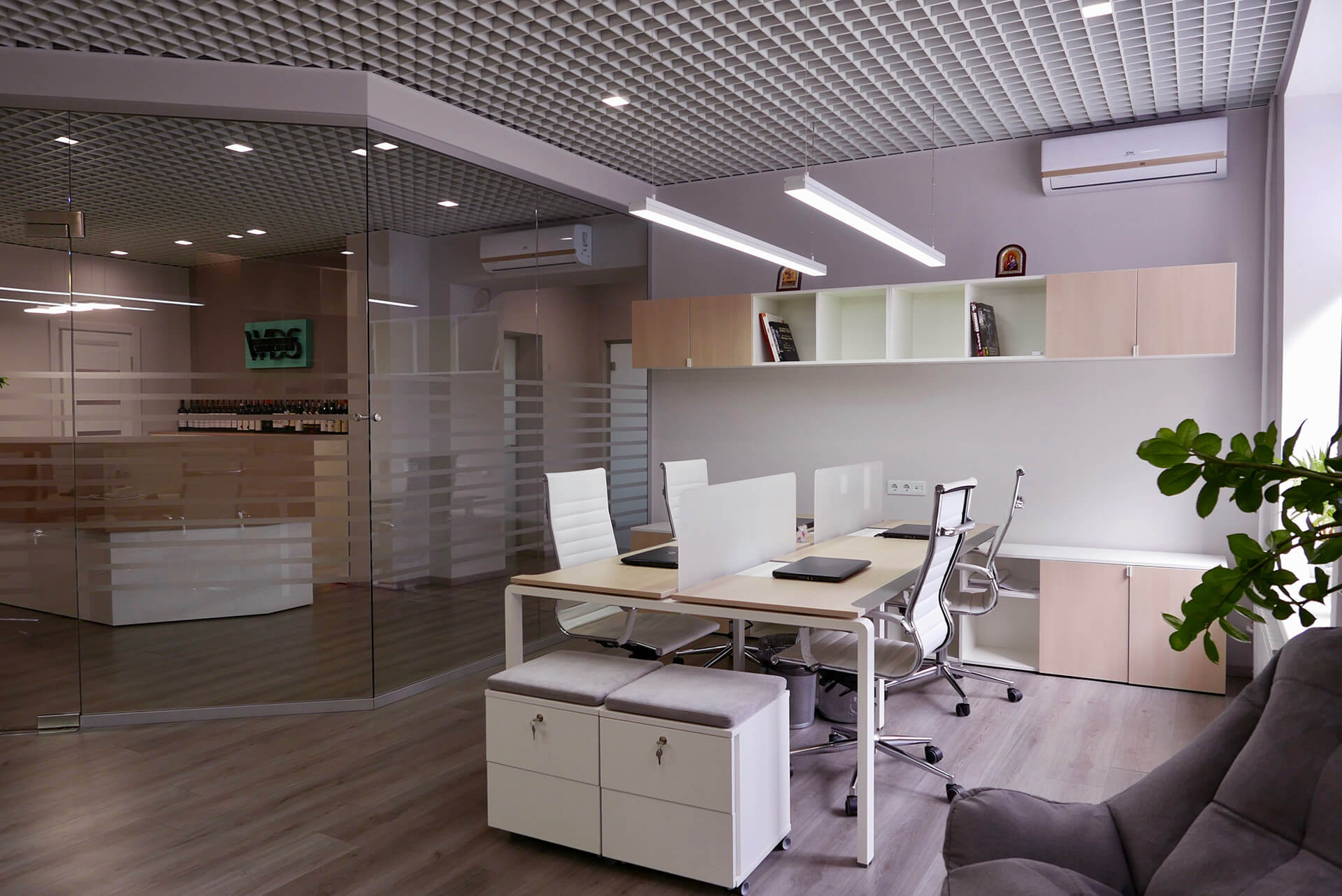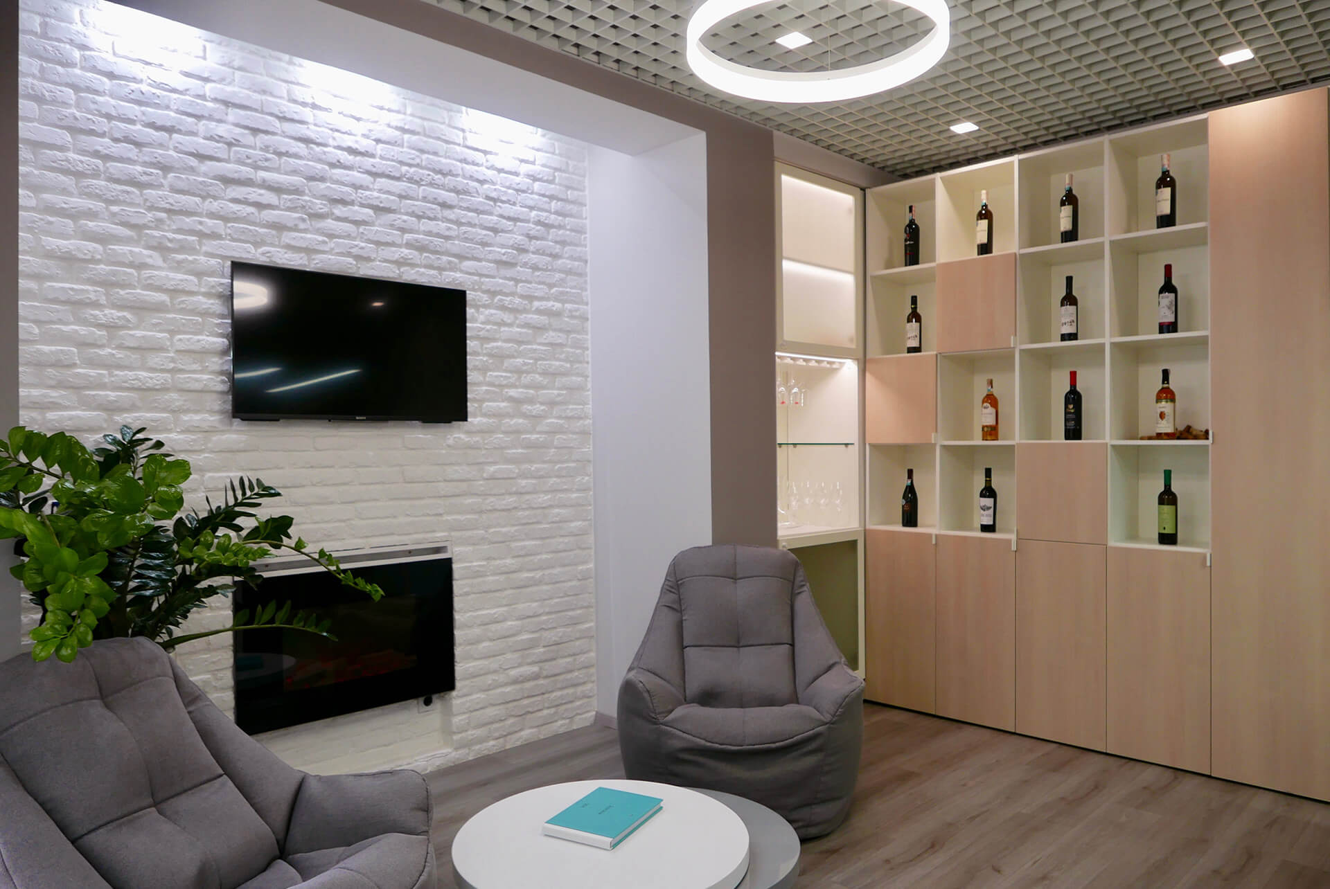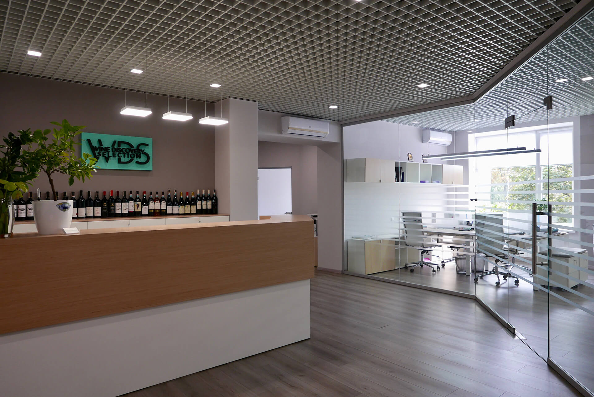 Основним завданням при створенні інтер’єру було з темного приміщення з маленькими кімнатами зробити відкритий просторий і світлий офіс, що відображає культуру і дух компанії. Особливістю стала лаунж-зона з каміном і винним баром для неформального спілкування співробітників і дегустацій з клієнтами. Ремонт був виконаний в найкоротші терміни і в рамках мінімального бюджету.